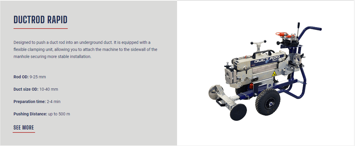 Designed to push a duct rod into an underground duct. It is equipped with a flexible clamping unit, allowing you to attach the machine to the sidewall of the manhole securing more stable installation.