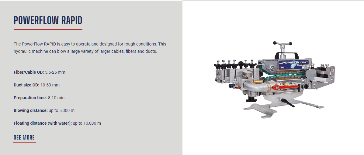The PowerFlow RAPID is easy to operate and designed for rough conditions. This hydraulic machine can blow a large variety of larger cables, fibers and ducts.